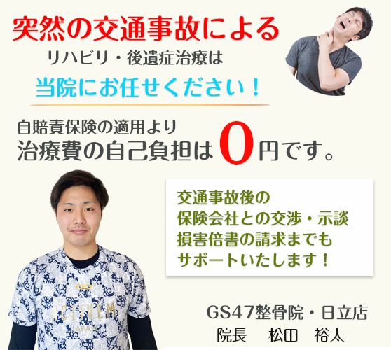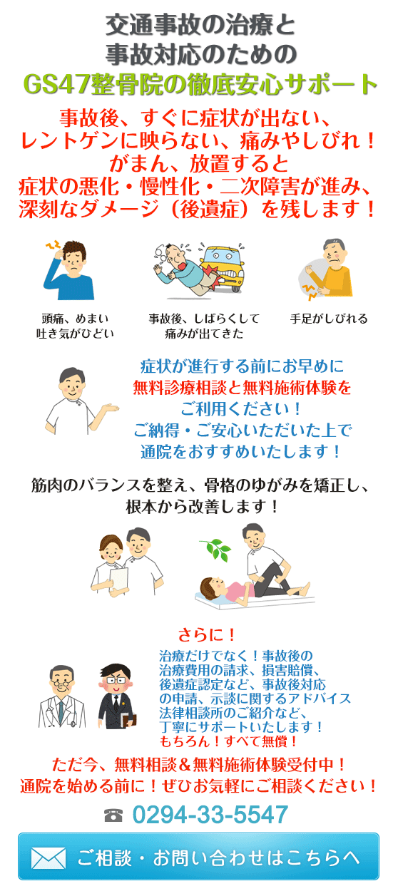 日立市・交通事故の治療専門!GS47整骨院  日立市で交通事故の治療なら損害賠償など法的な手続きの相談・サポートもお任せください!