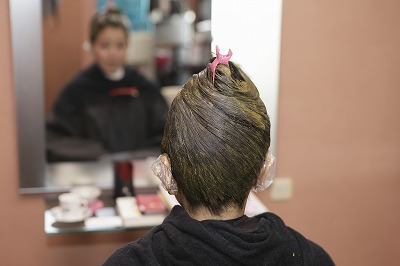 4頭皮に直に塗ることができる化粧品染料を使用。