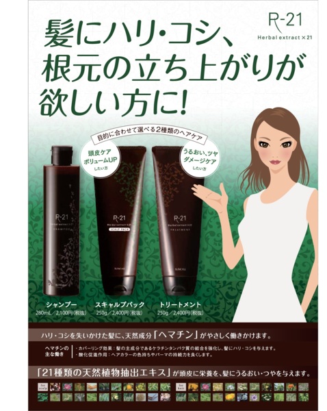 また、スペシャルケアパックトリートメント(ハリコシ)¥2500(税込)をしていただくと、R-21ヘマチンシャンプー(¥2260)プレゼントをしています。